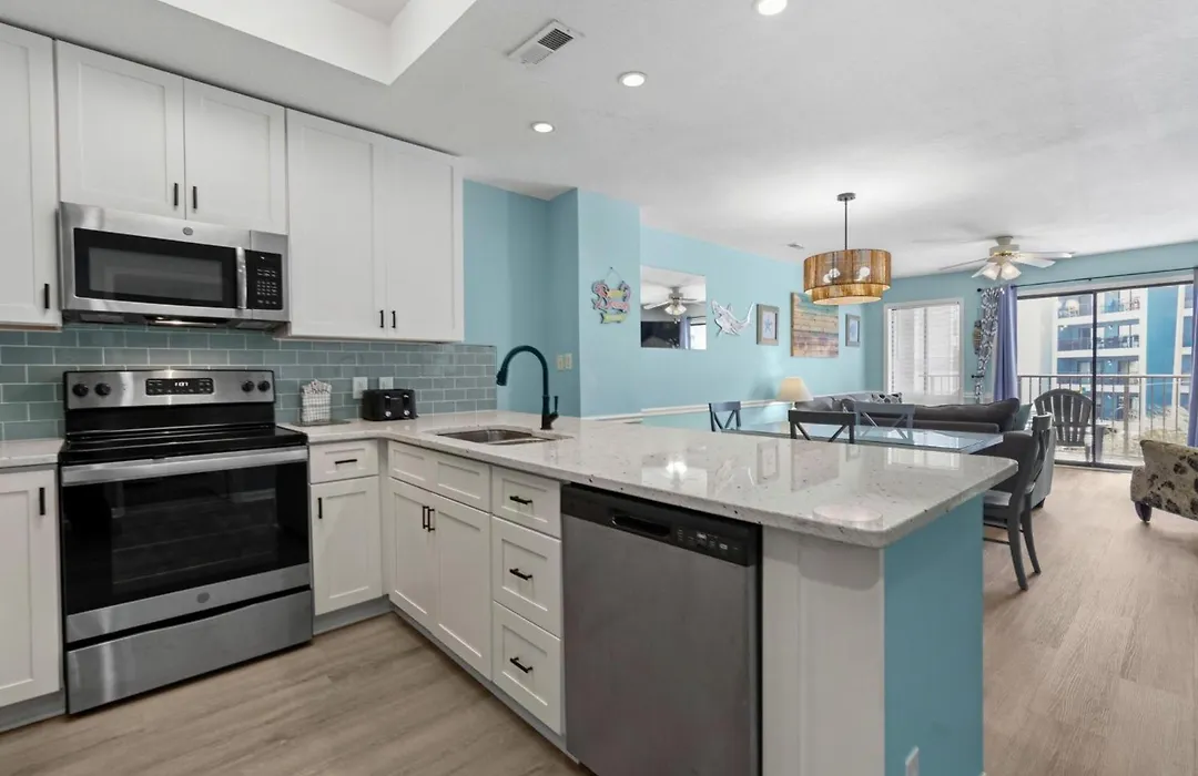 Myrtle Beach Resort A224 villa has an equipped kitchenette with tea and coffee making facilities, a refrigerator, and kitchenware for a comfortable stay.